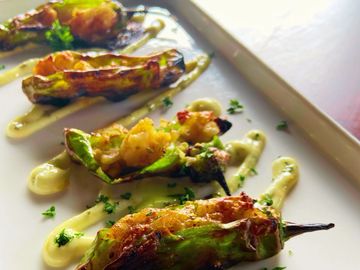 Oven roasted shrimp and cheese stuffed shishito peppers. Citrus aioli.