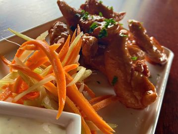 "Zeus", BBQ honey hot or just plain hot. Pickled carrots and celery. Ranch or blue.
