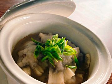 Tavern blend pork and roast veggie pot stickers in a bacon dashi